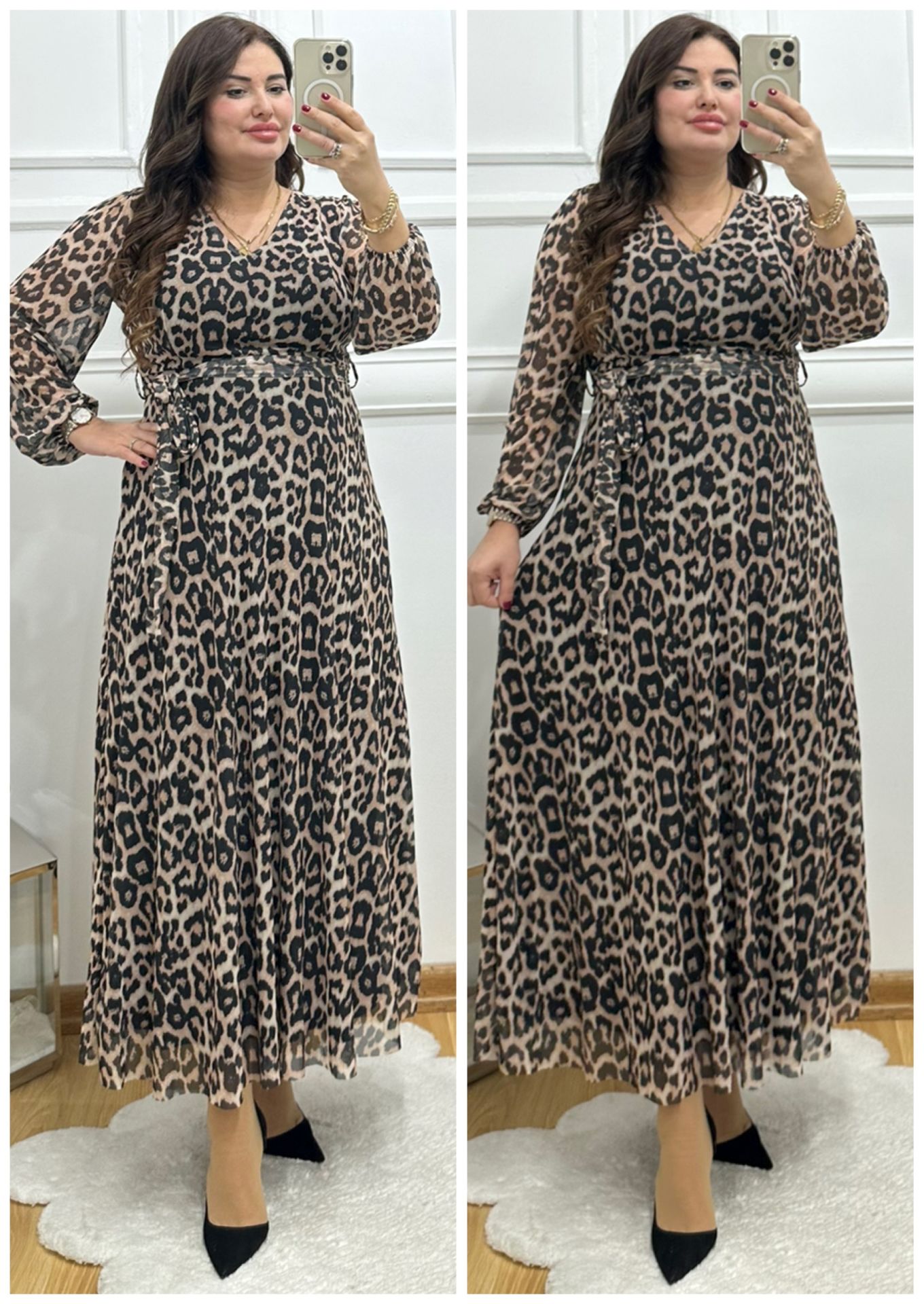 A067-Leopar desen V yaka kuşaklı maksiboy şifon elbise