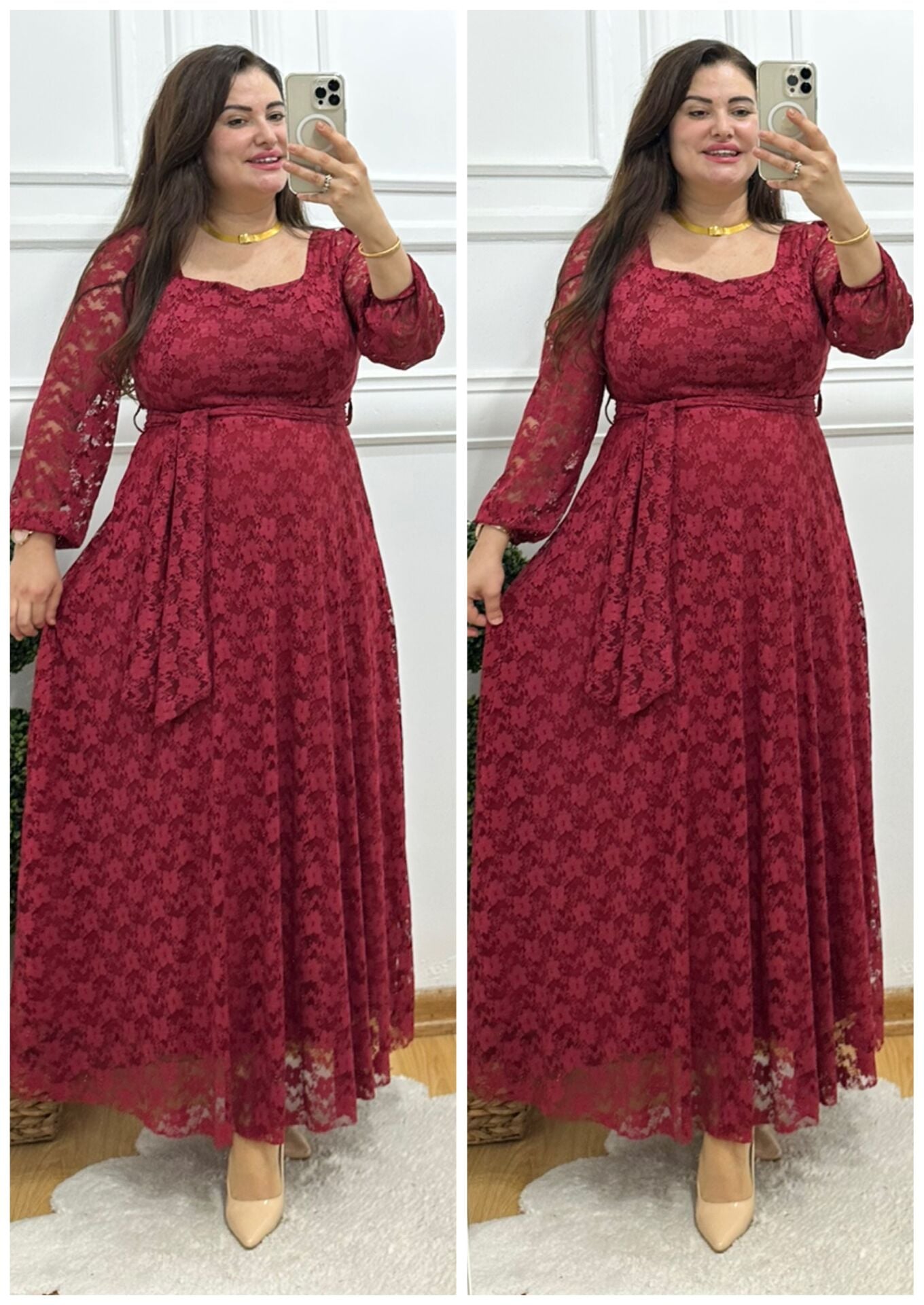 A146-Bordo prenses dantel kare yaka elbise