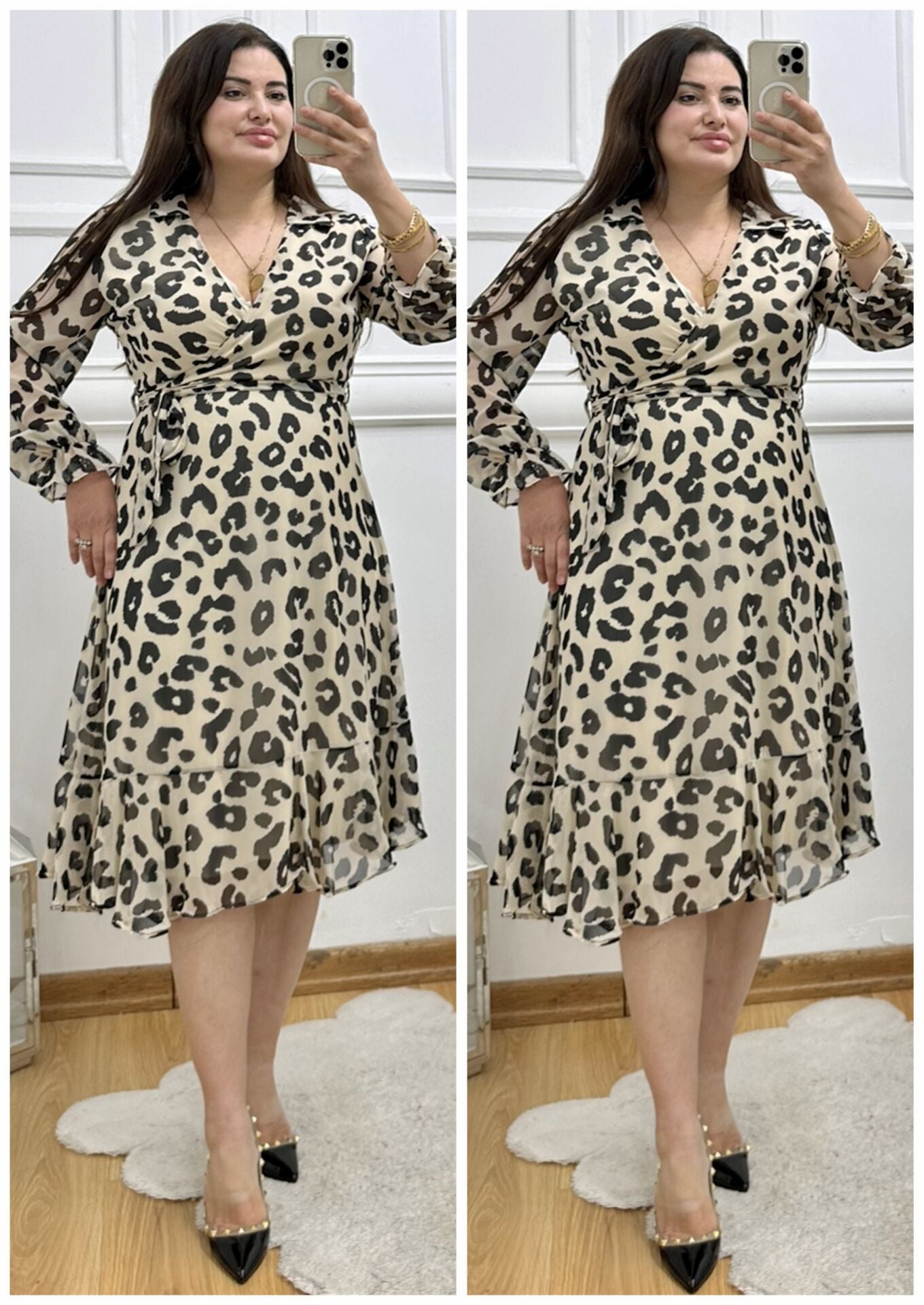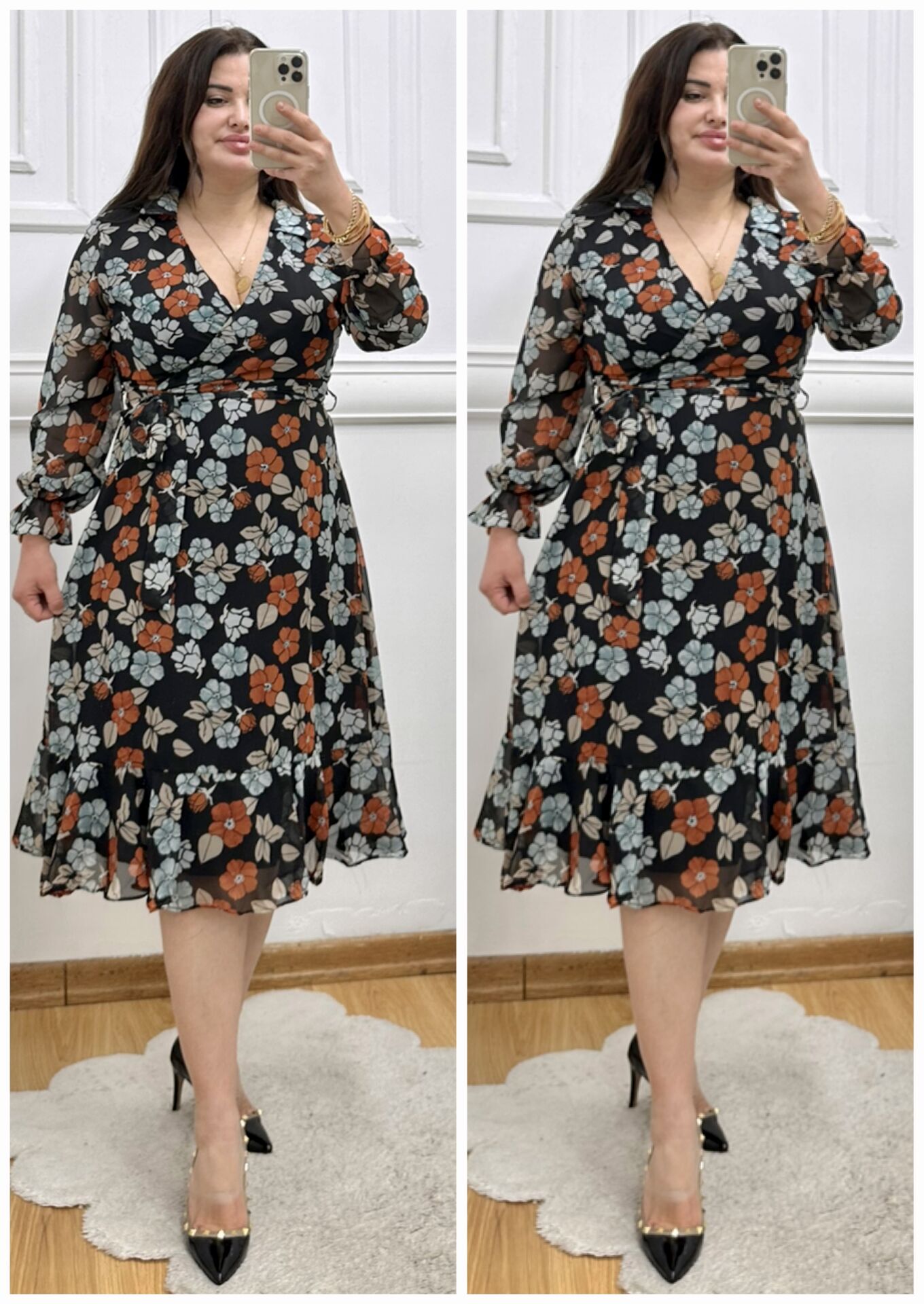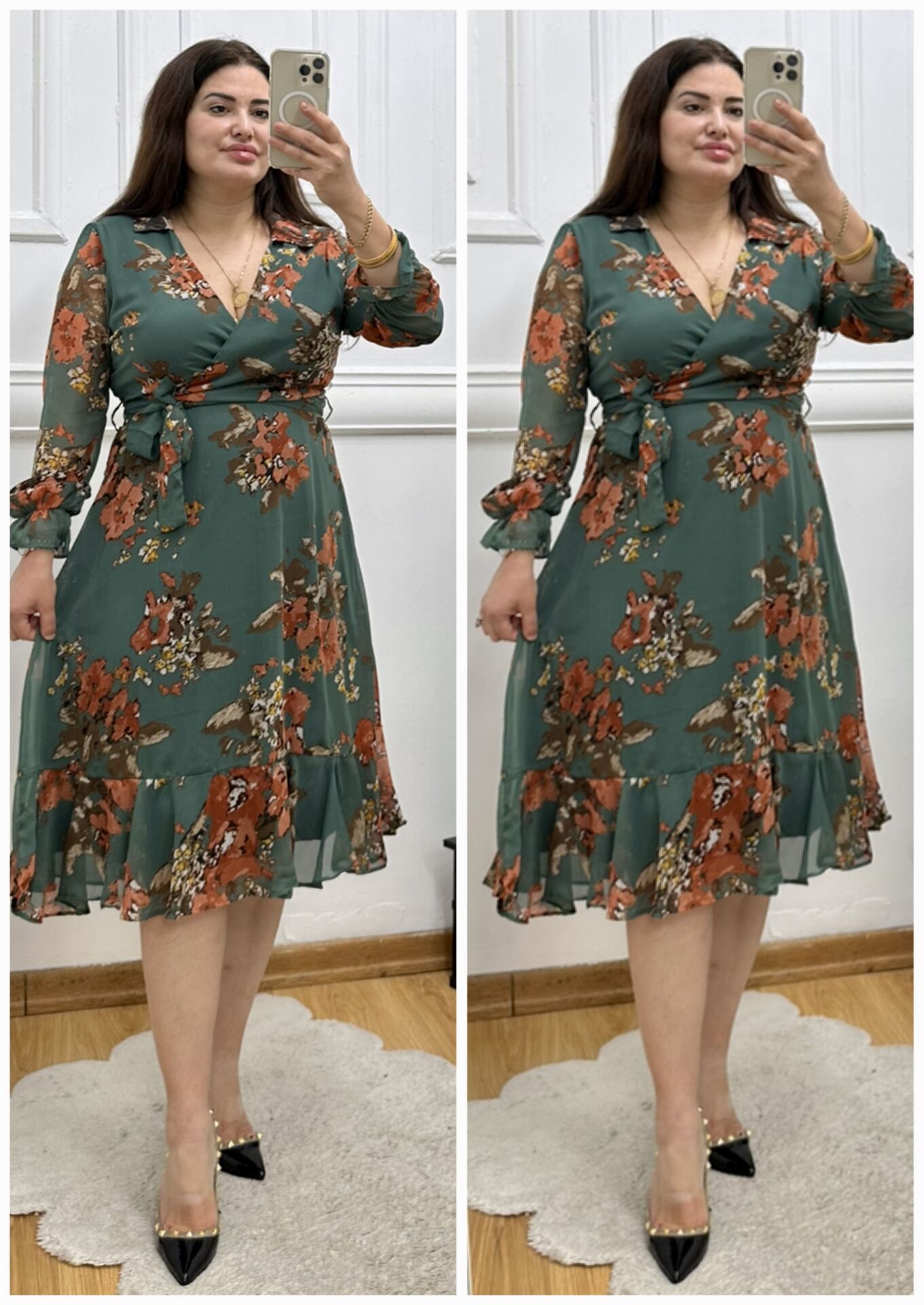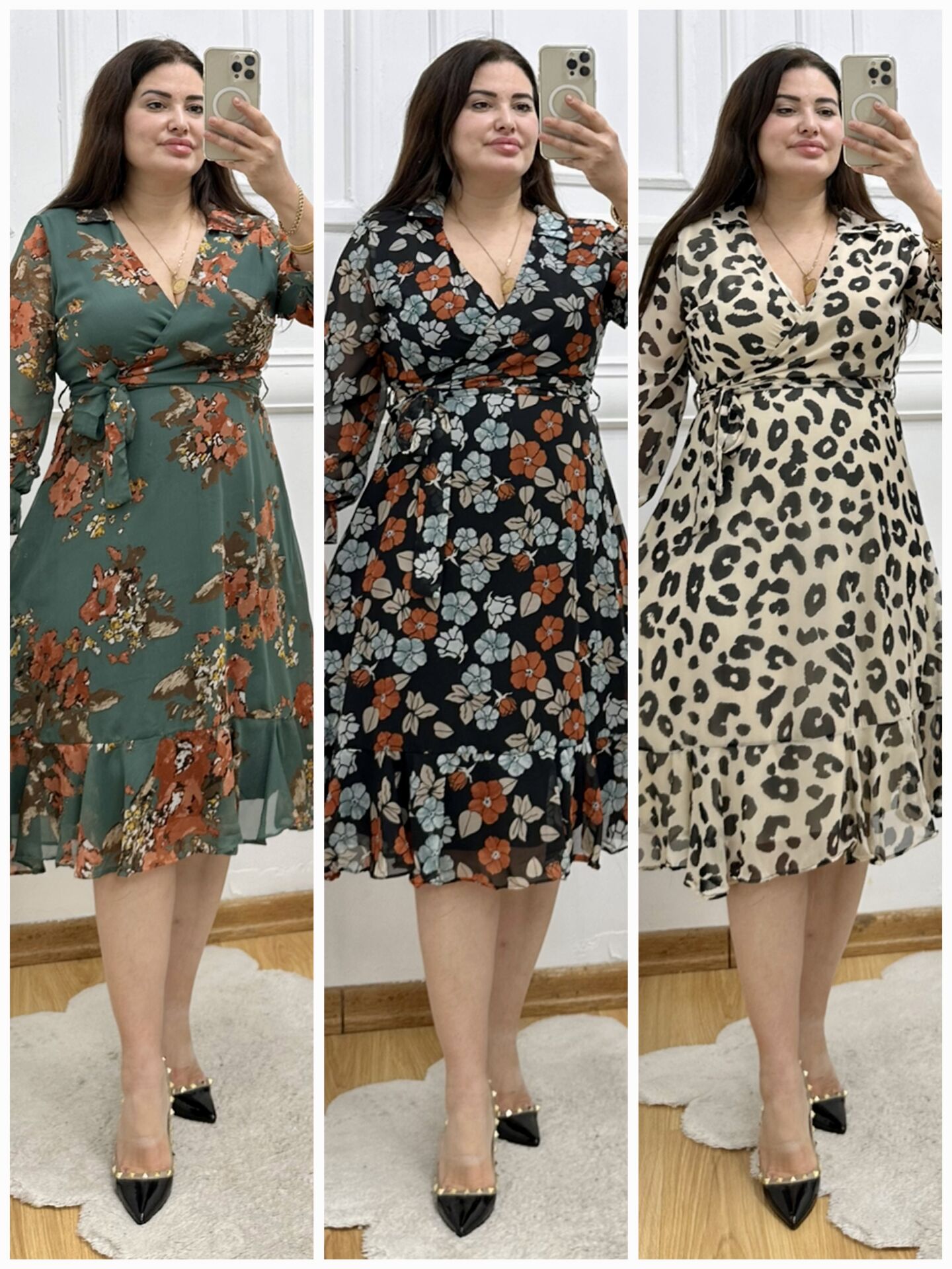 A157-Şifon gömlek yaka kuşaklı midiboy elbise
