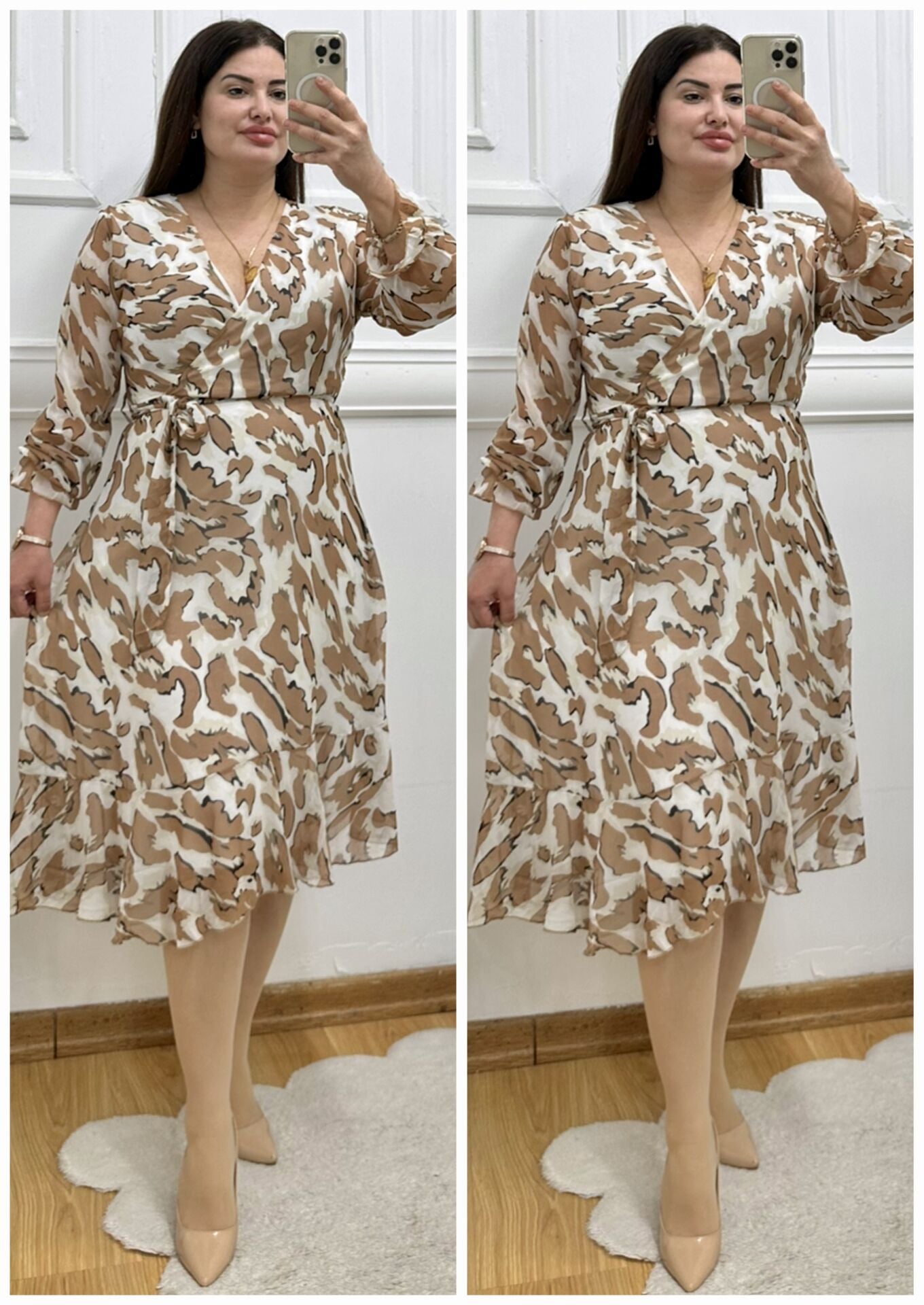 A159-Şifon kruvaze yaka kuşaklı midiboy elbise