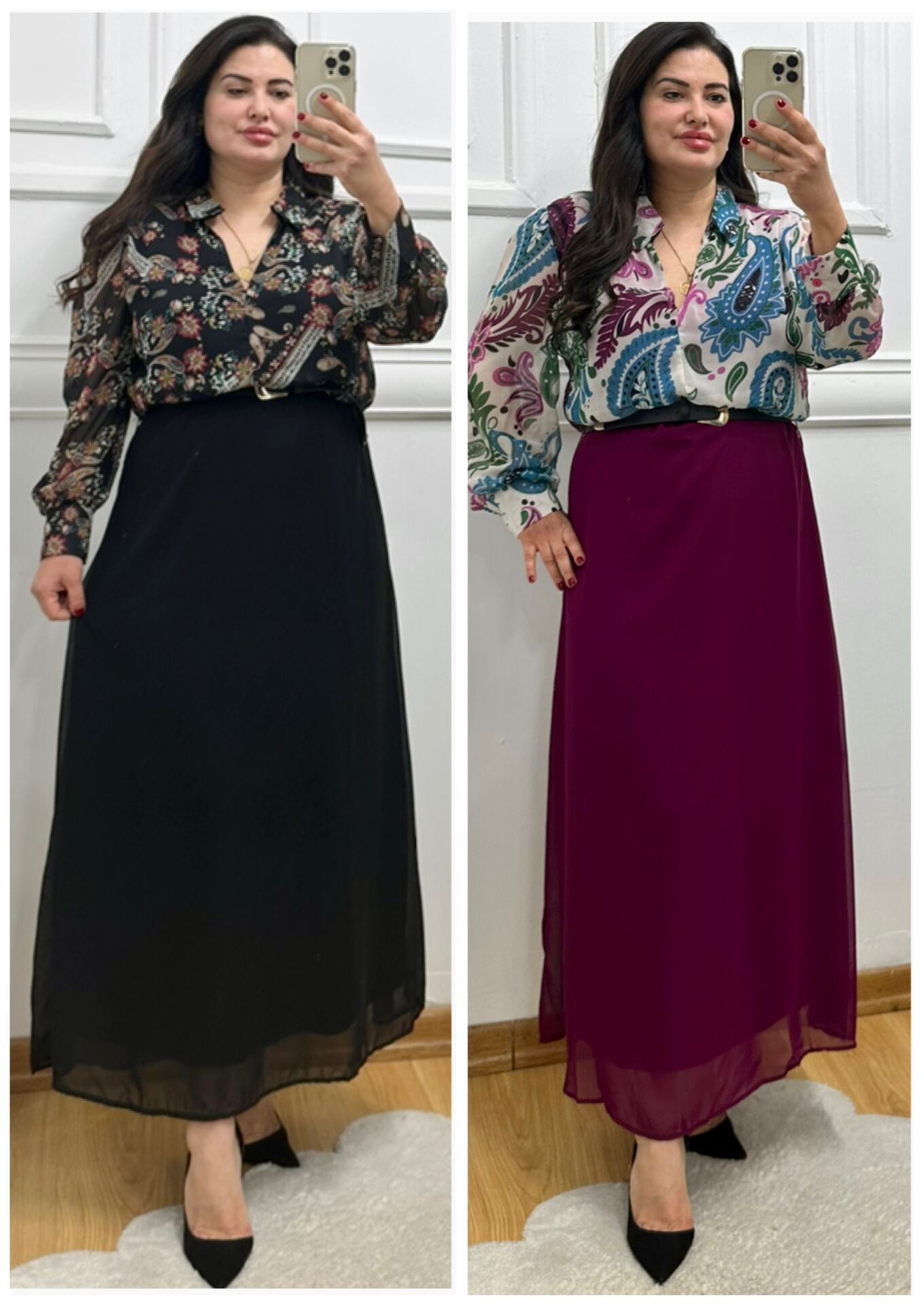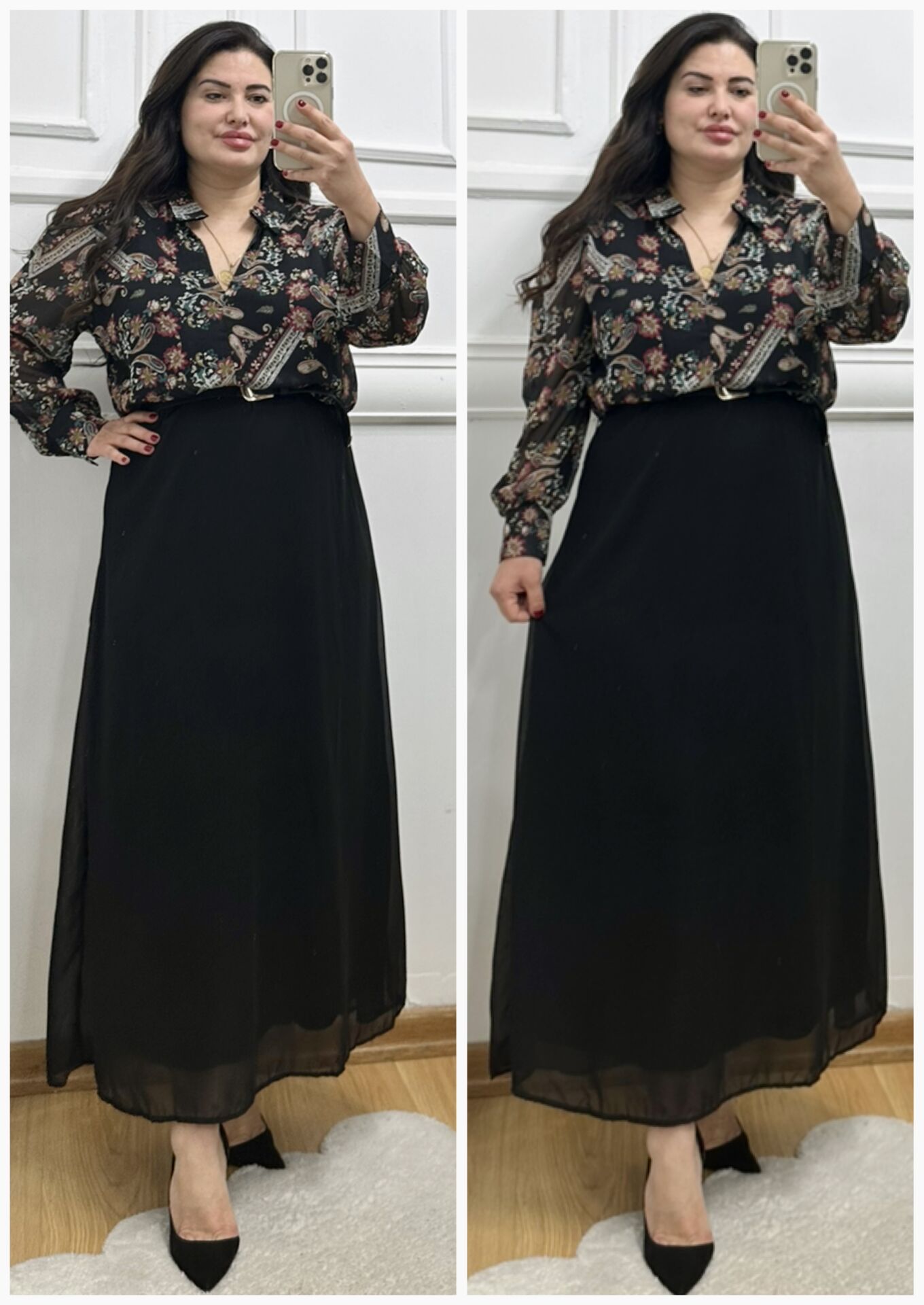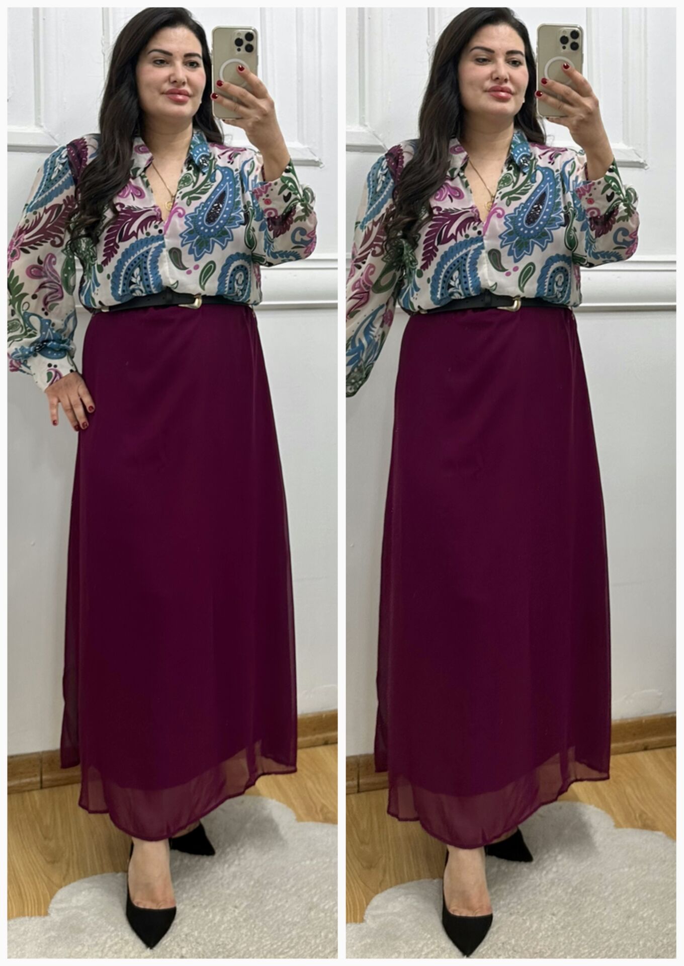 A161-Paisley desenli Maksi boy kemerli şifon elbise