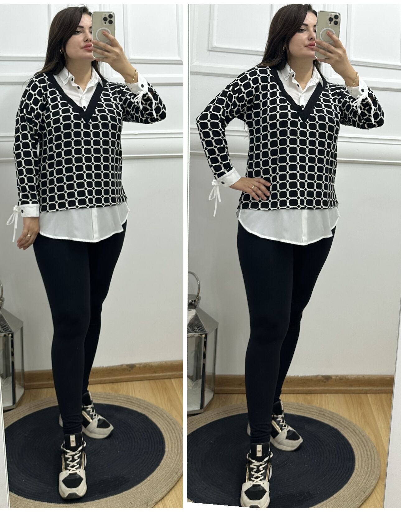 FT031-Siyah beyaz çengel desen gömlekli tunik