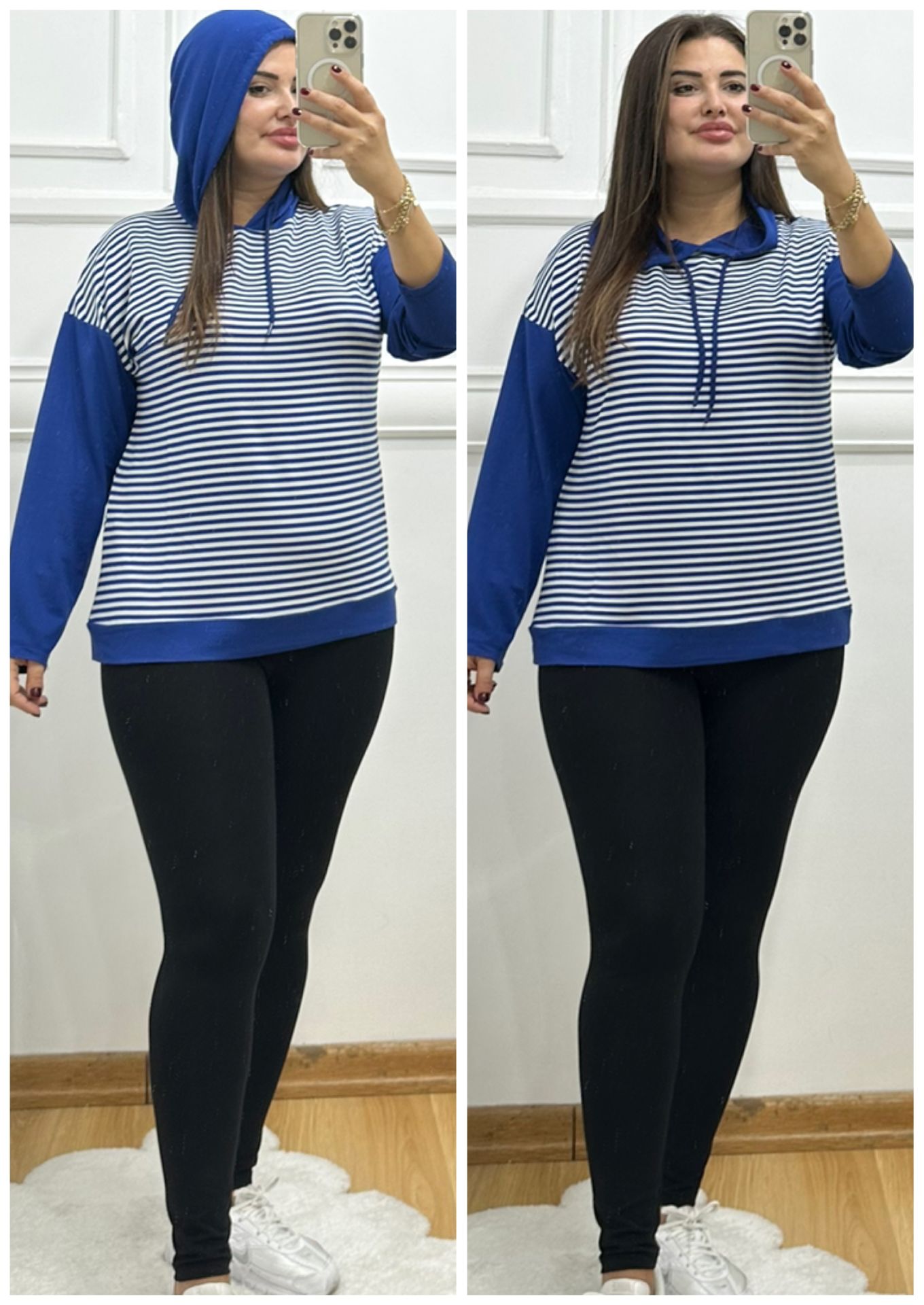 FT053-Mavi beyaz çizgili kapşonlu tunik