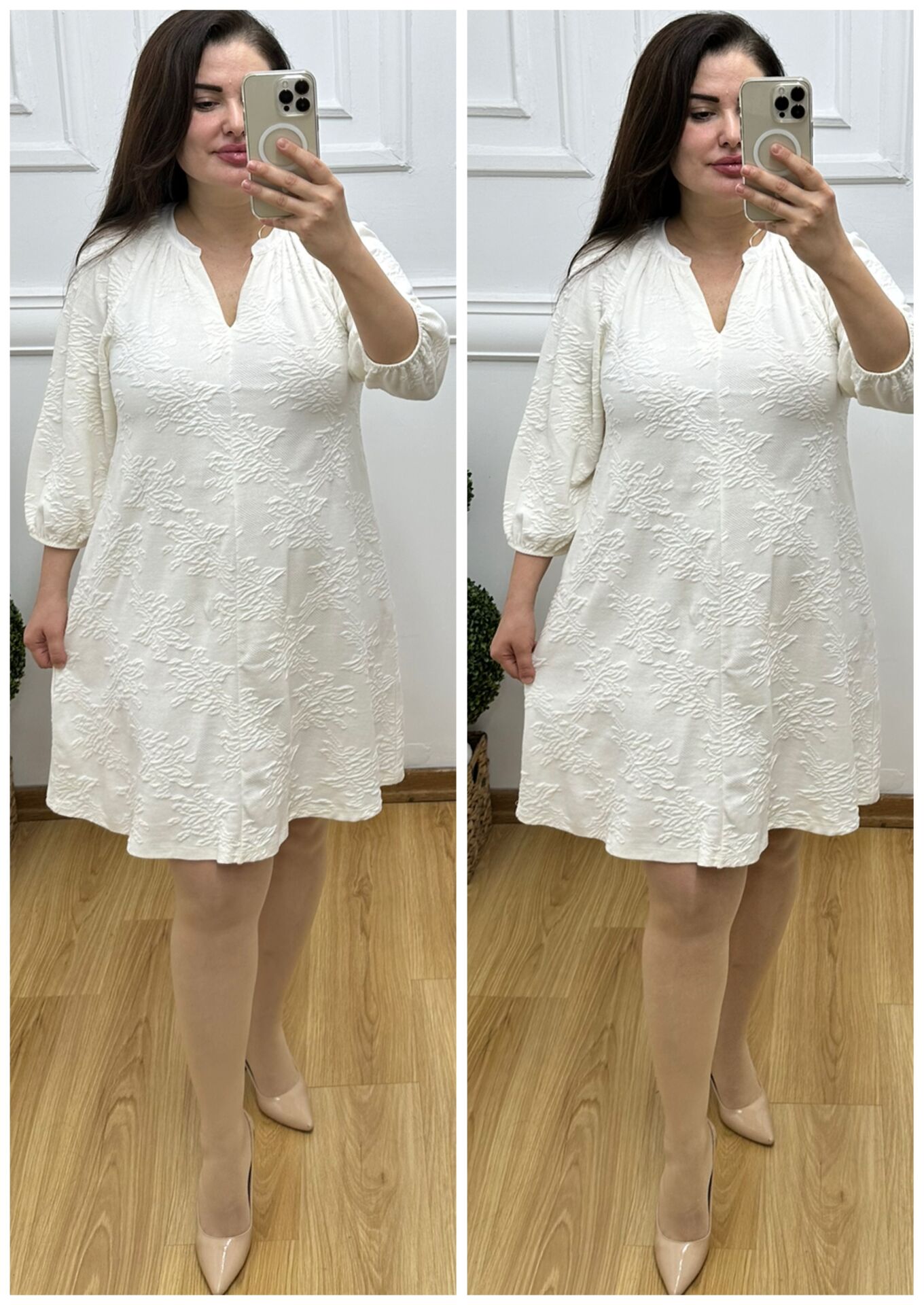 SF043-Krem kabartma desenli elbise
