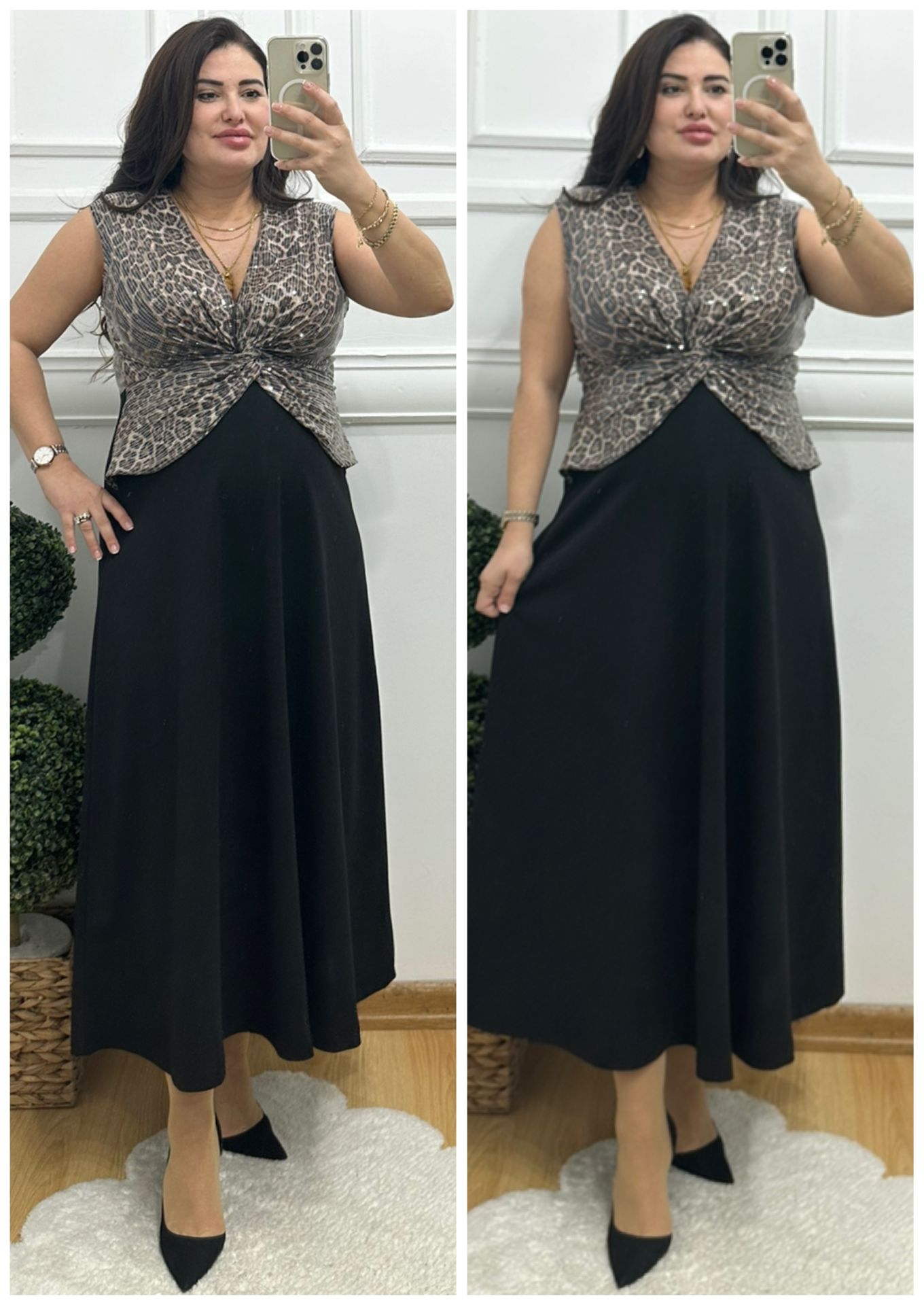 TR073-Kruvazesi leopar desen önü düğüm detaylı abiye elbise