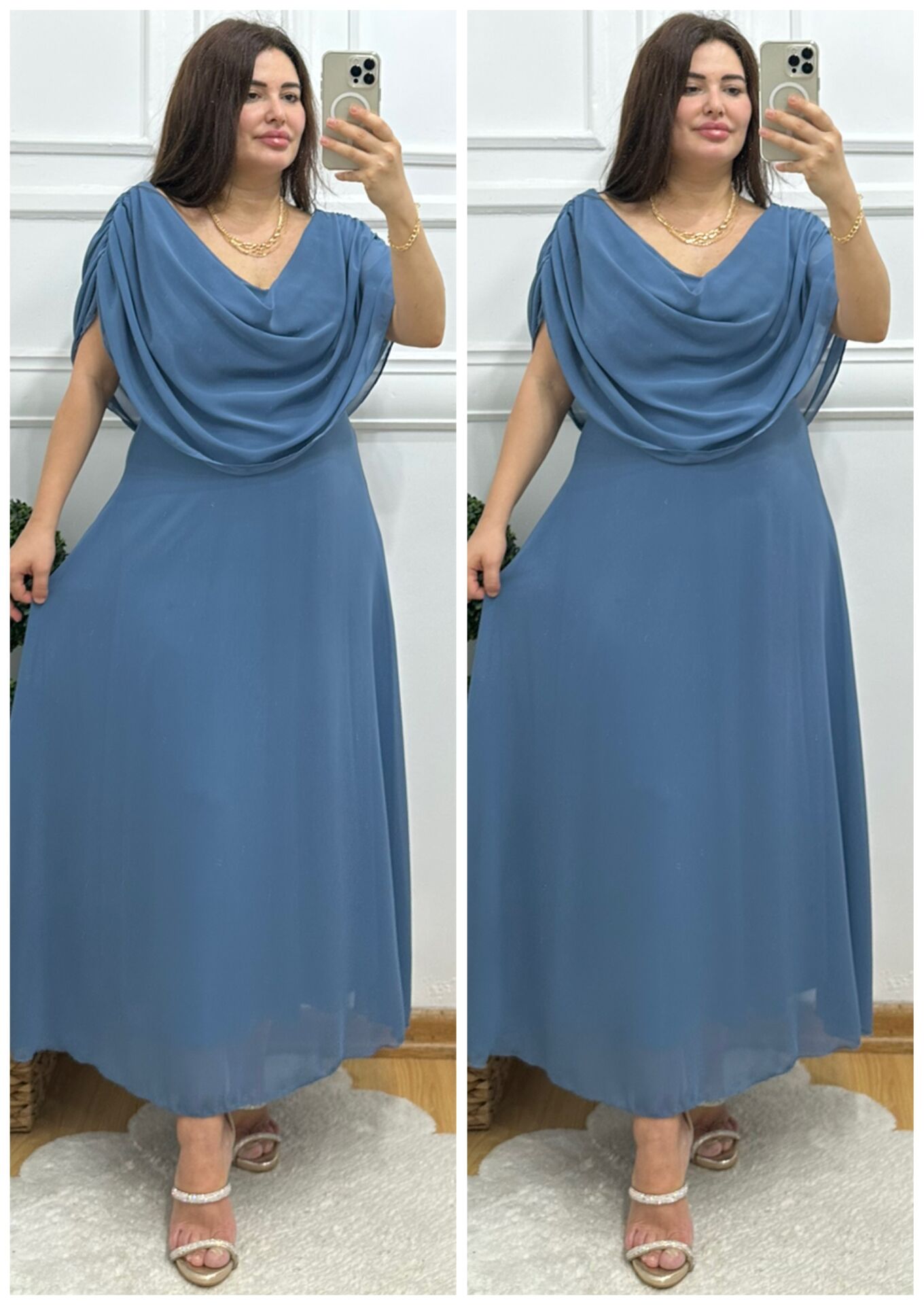 TR109-İndigo mavisi organze şifon kolu drapeli elbise