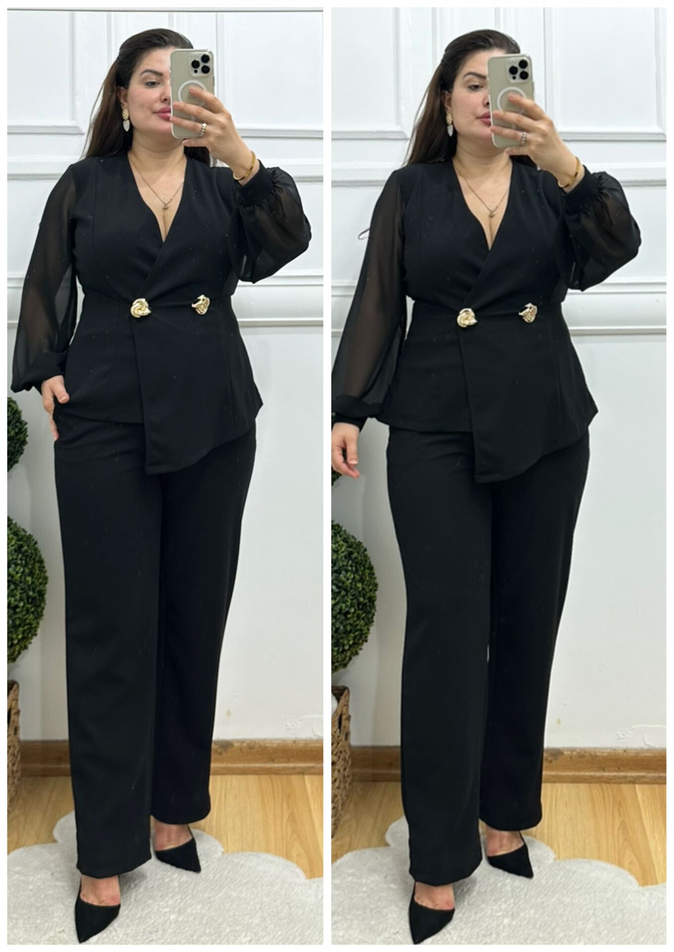 TR129-Siyah gold broş detaylı uzun kol ikili takım