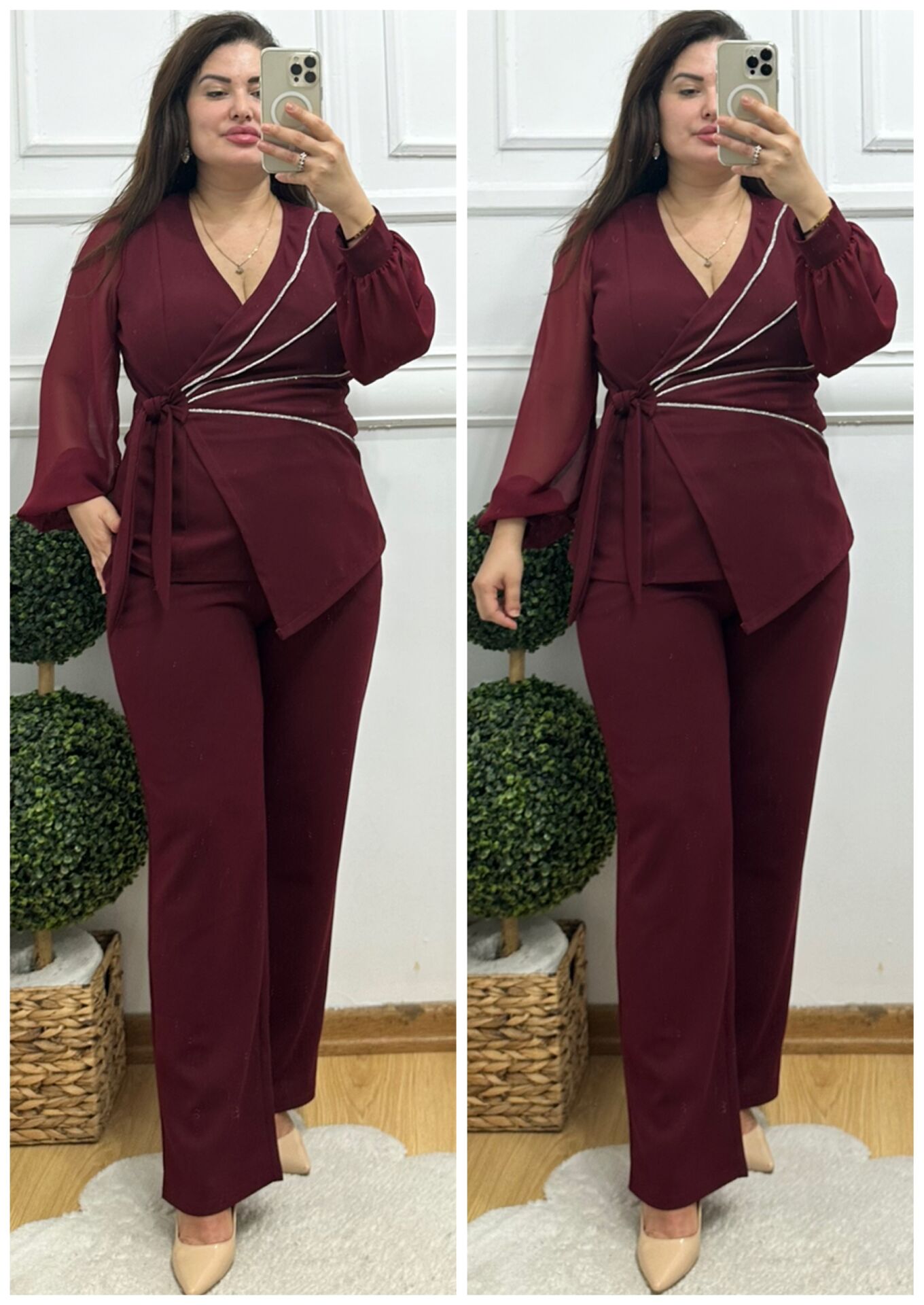 TR132-Bordo sıvama taş çapraz detaylı uzun kol ikili takım