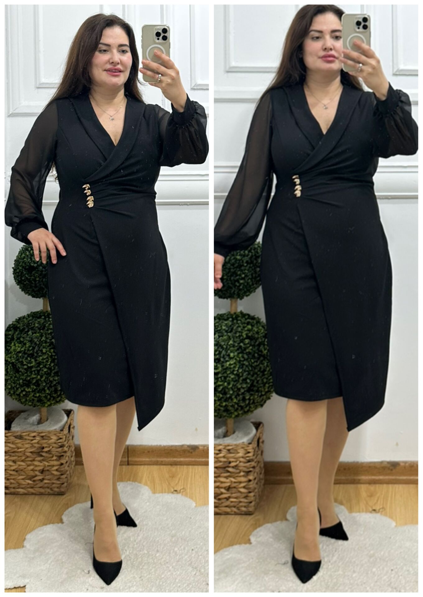 TR139-Siyah kruvaze yaka üç broşlu kolları şifon abiye