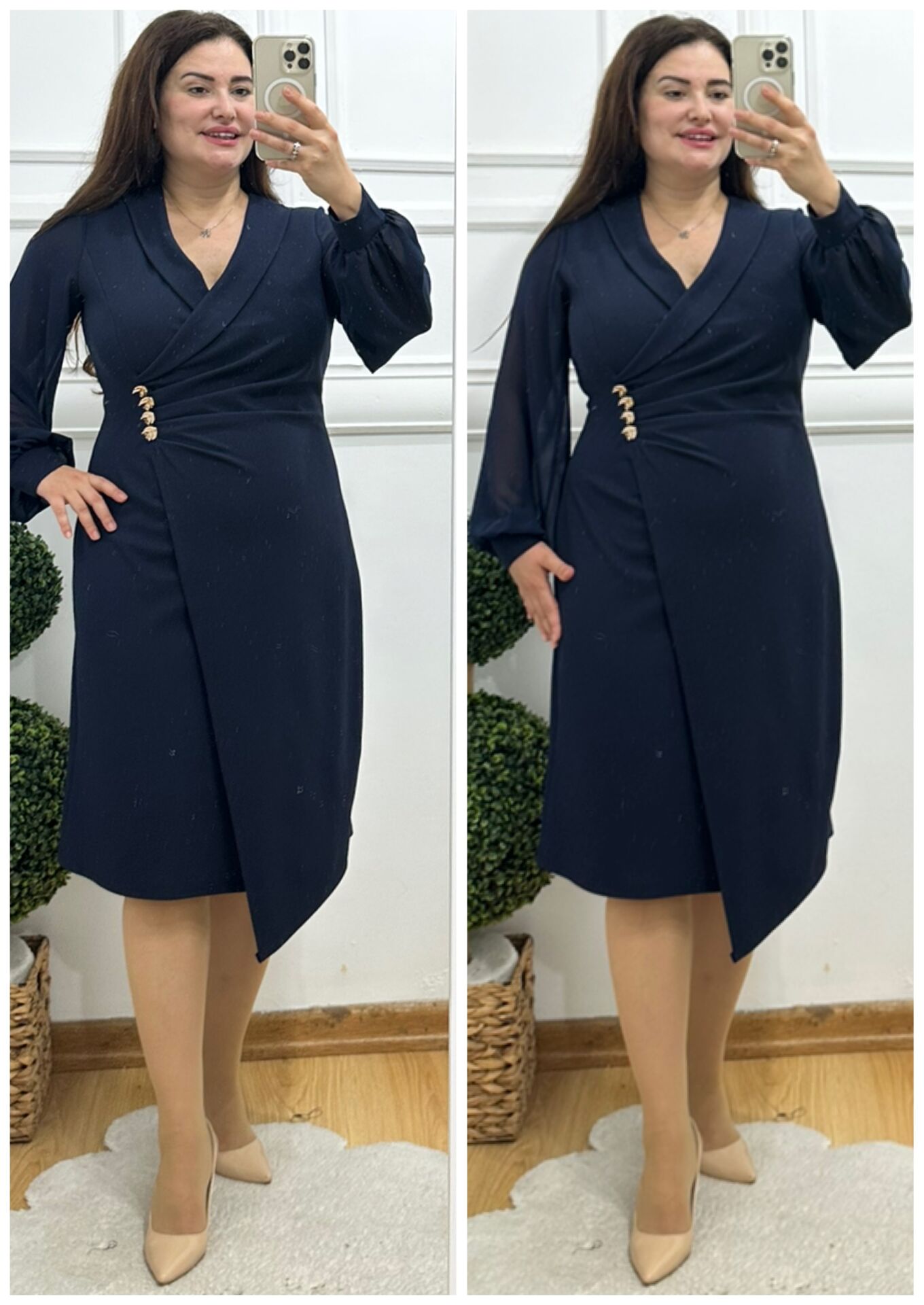 TR141-Lacivert kruvaze yaka üç broşlu kolları şifon abiye