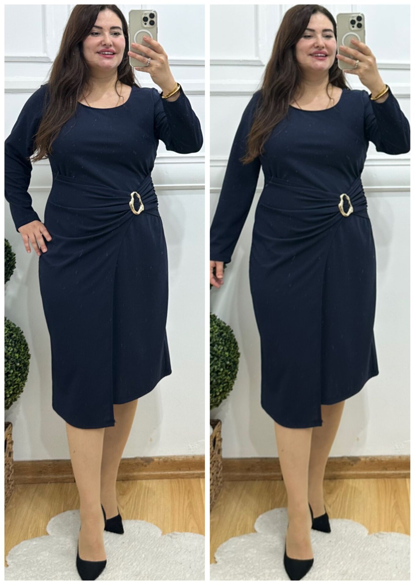TR143-Lacivert yuvarlak yaka beli gold tokalı abiye