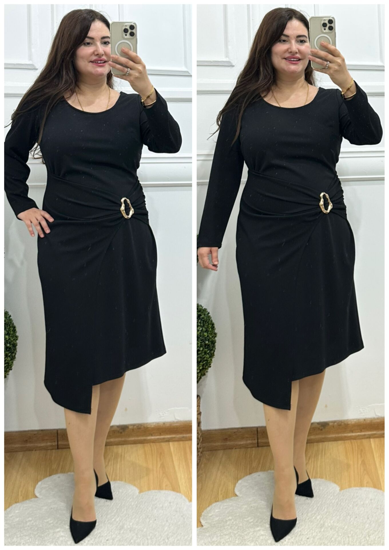 TR144-Siyah yuvarlak yaka beli gold tokalı abiye