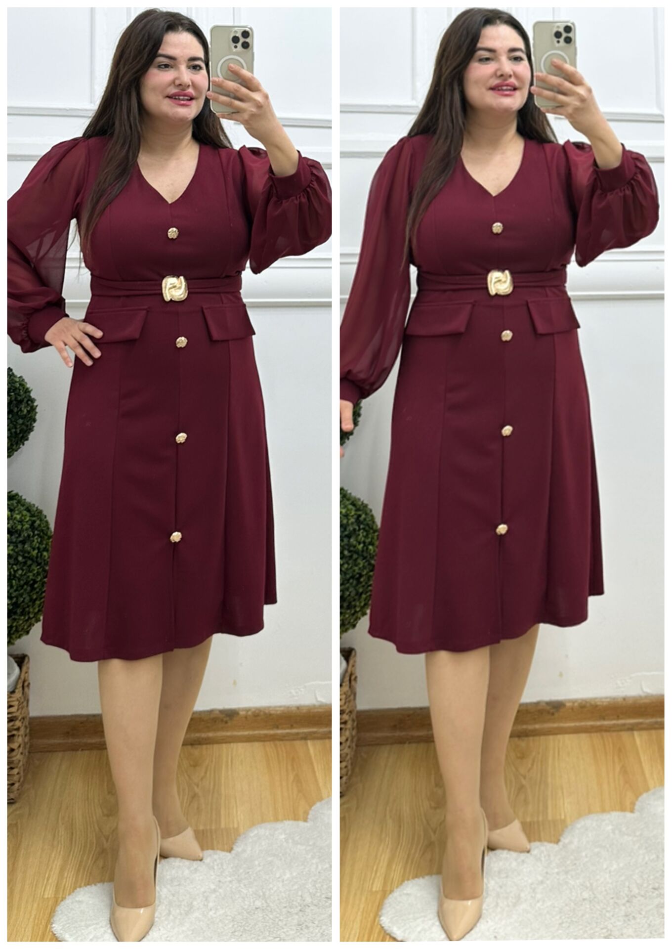 TR153-Bordo gold tokalı organze kol detaylı abiye elbise