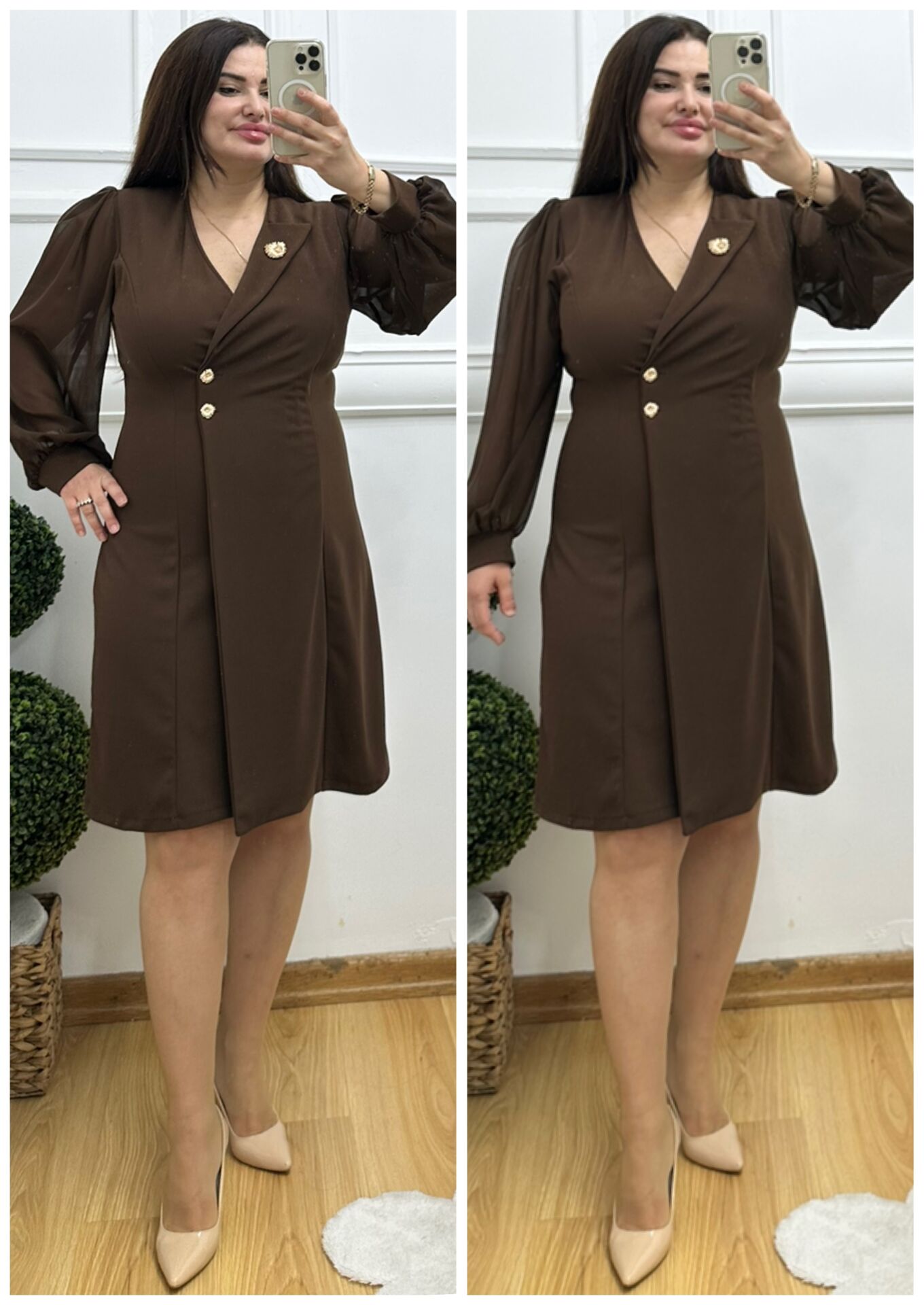 TR157-Kahve gold broş çift düğme şifon kol abiye elbise