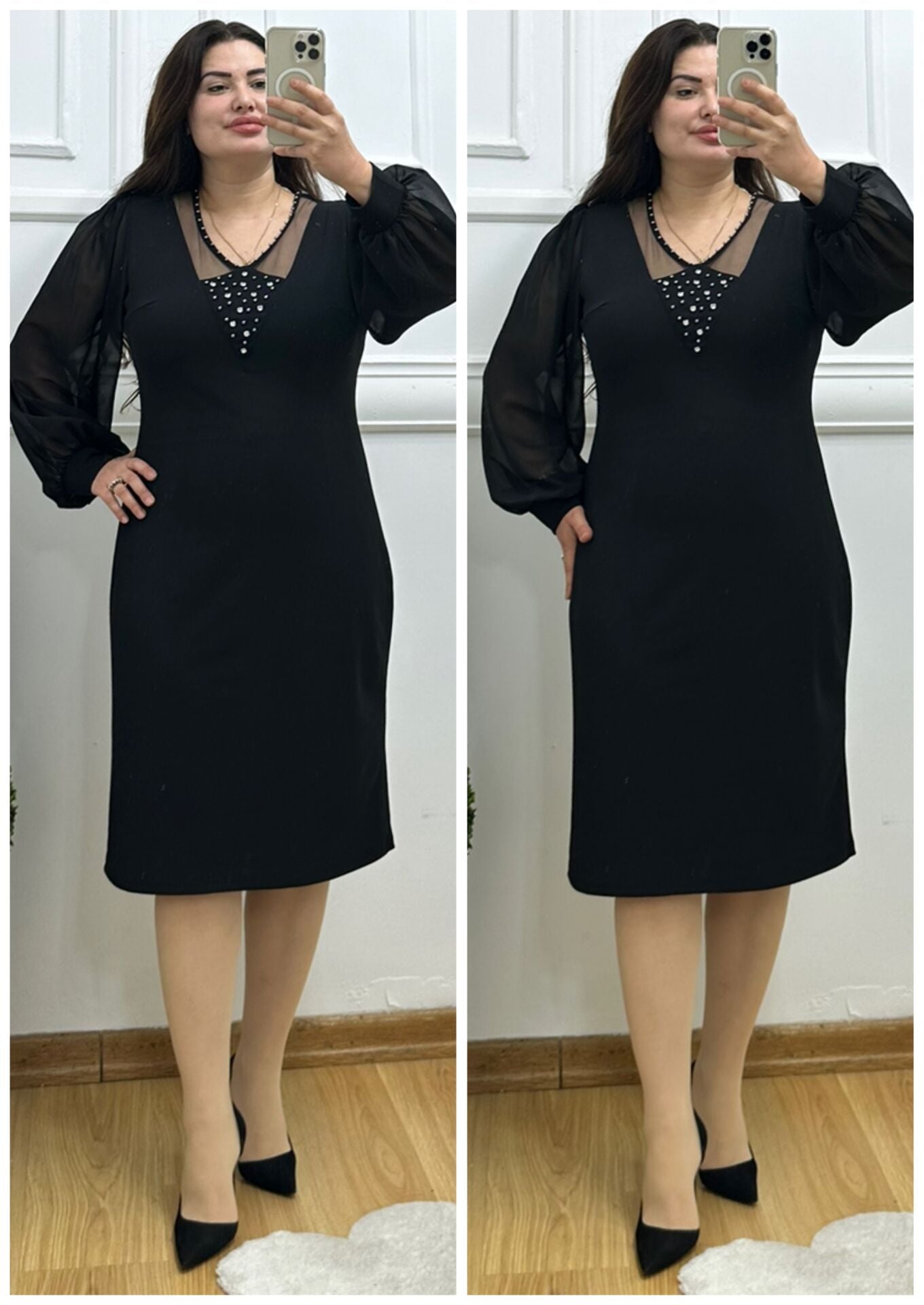 TR159-Siyah boncuk işlemeli tül detaylı abiye