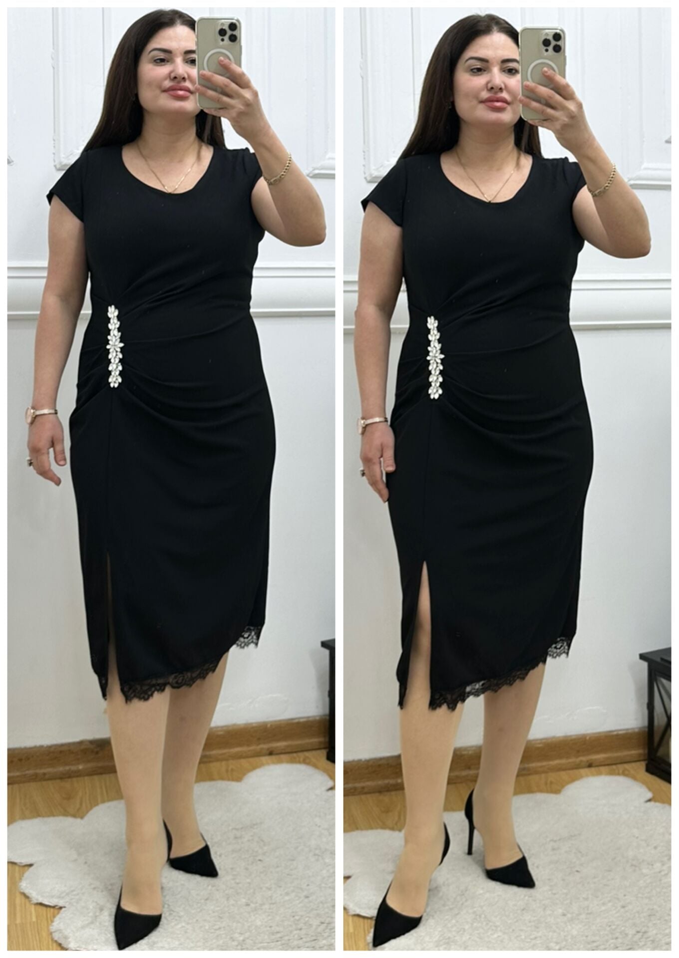 TR180-Siyah yan drape detaylı taş broşlu elbise