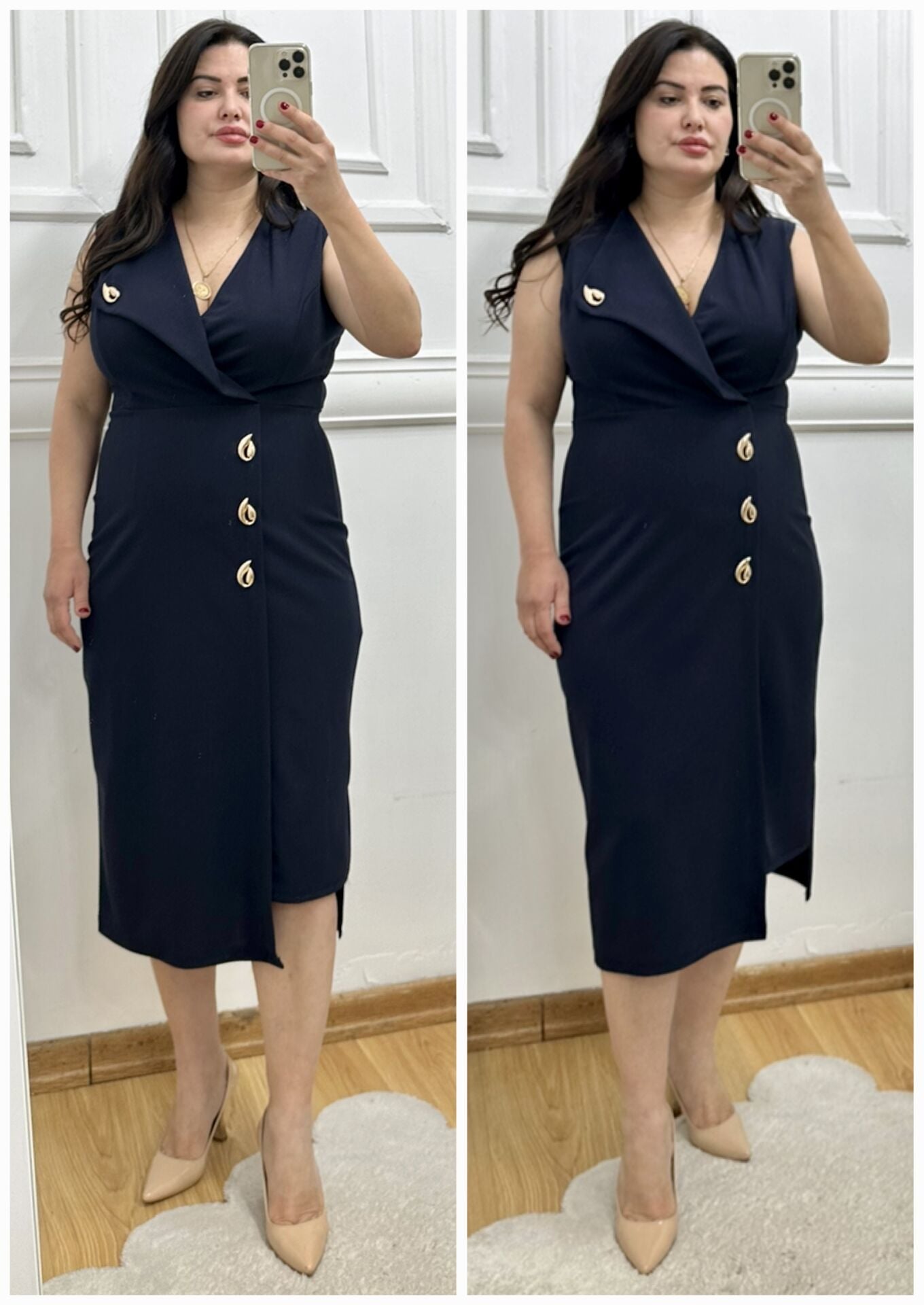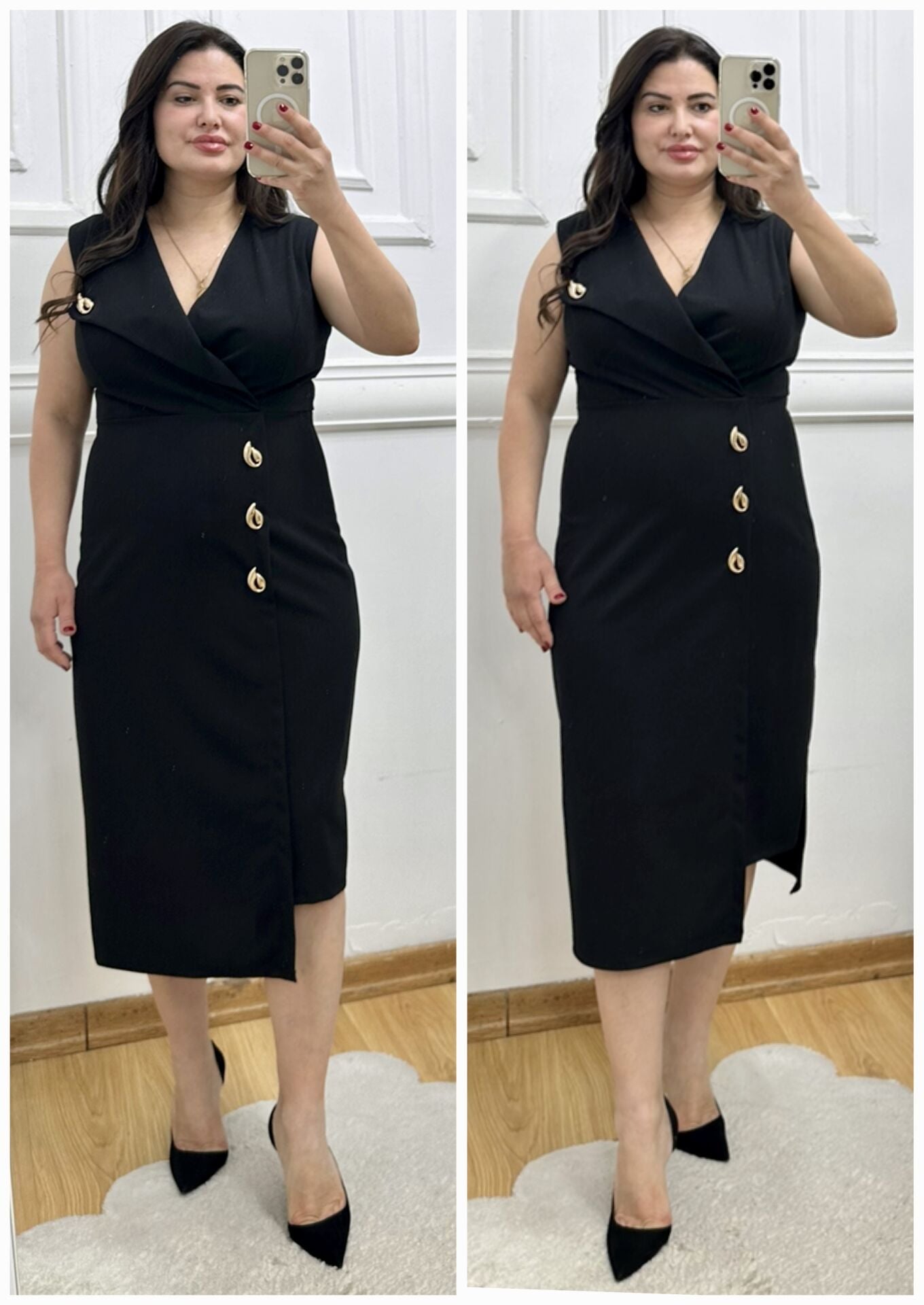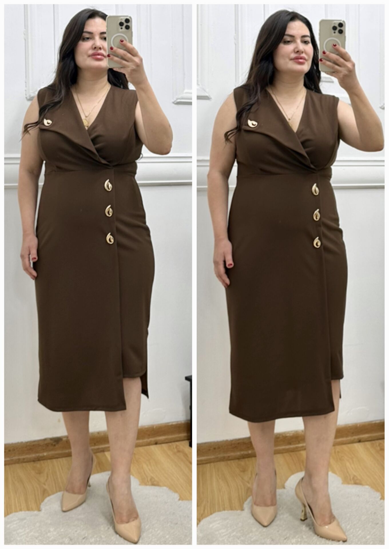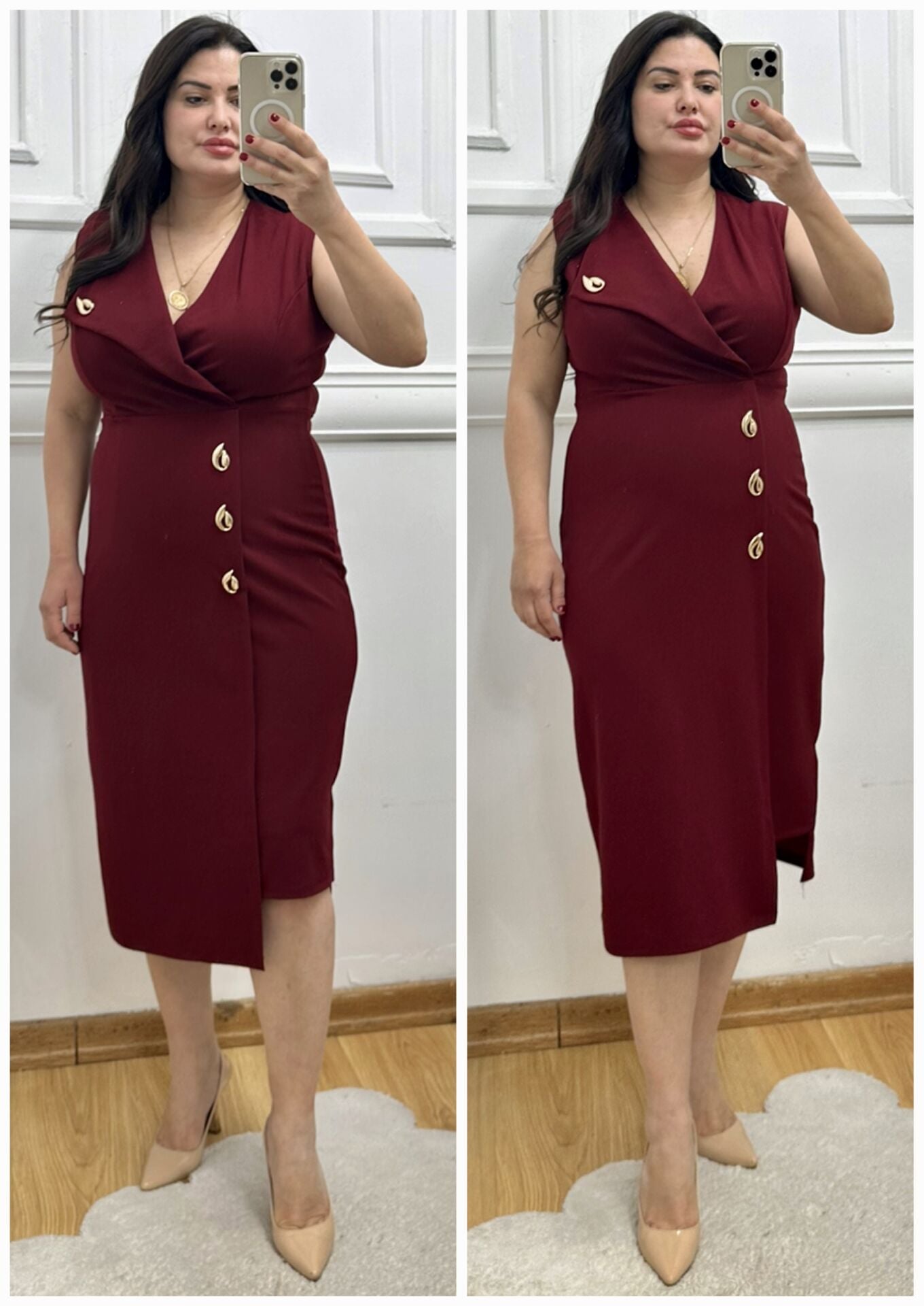TR183-Damla gold broş detaylı kruvaze yaka elbise
