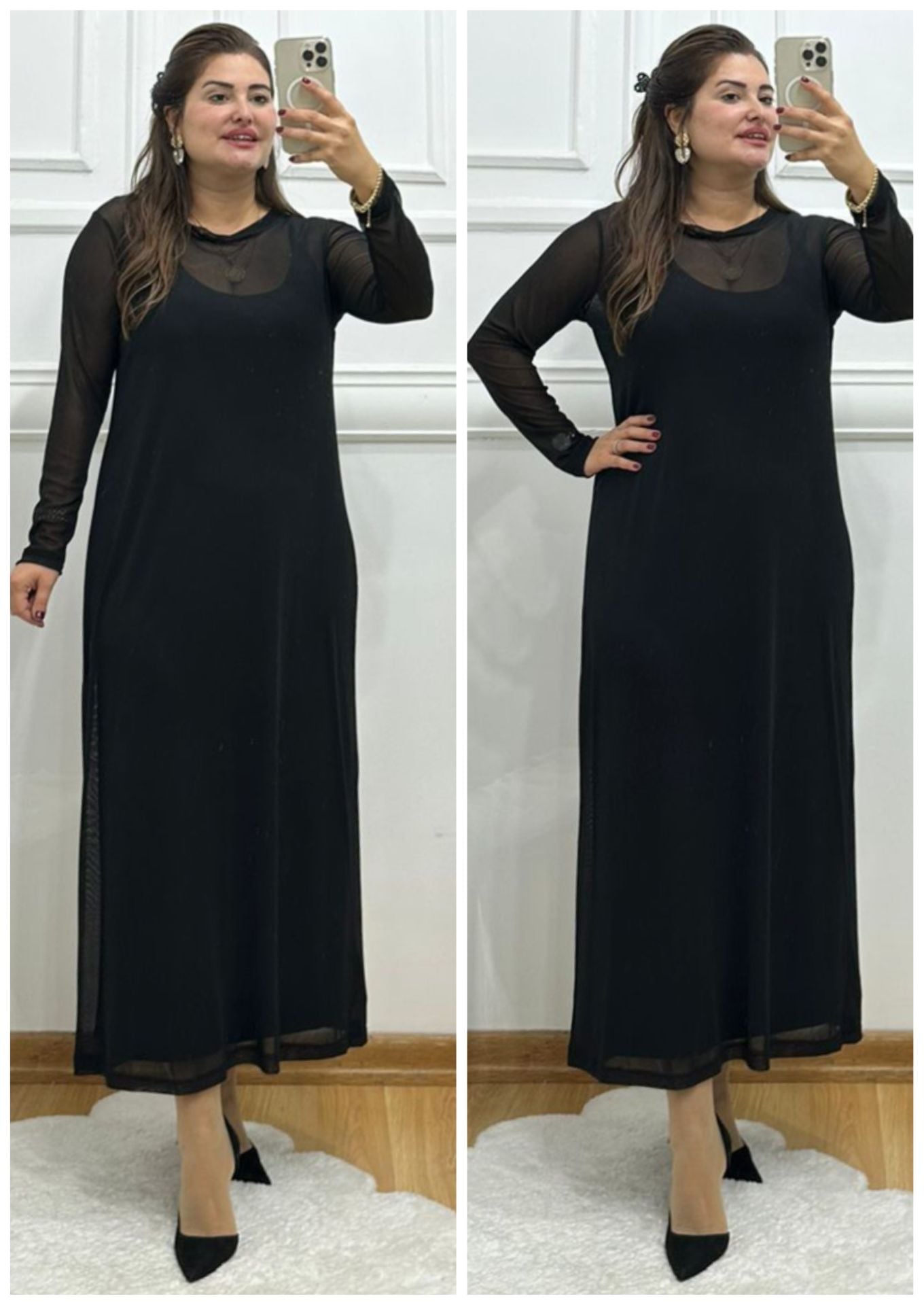 ZS042-Siyah hayaltül askılı atlas kumaş maksiboy elbise