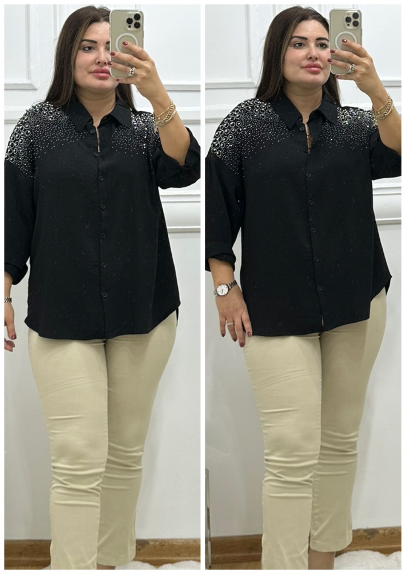 ZS045-Siyah yakası taşlı gömlek