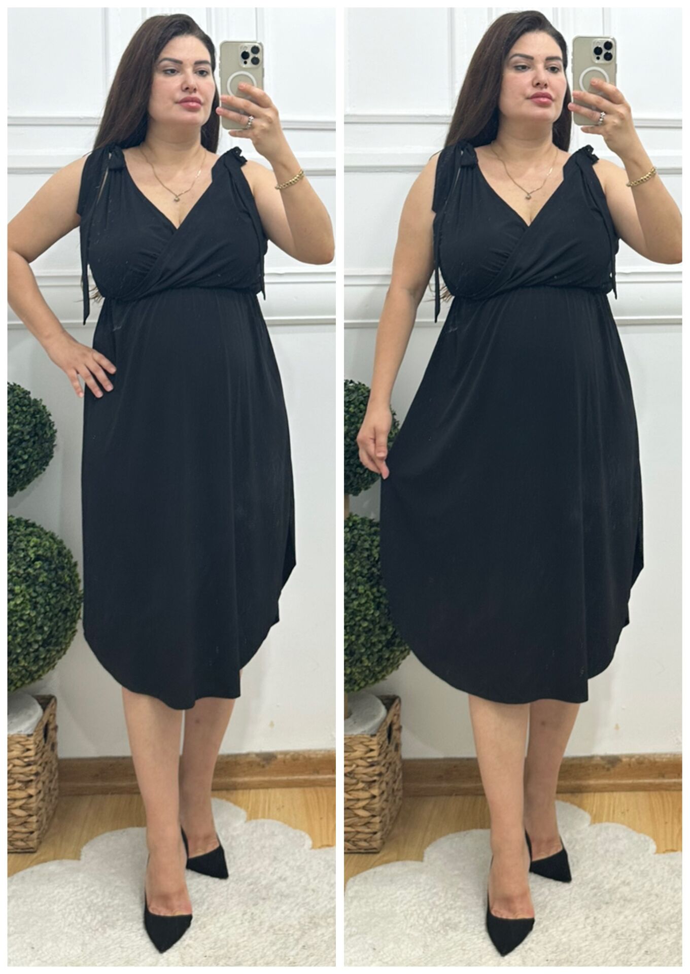 ZS111-Siyah kruvaze yaka bağlamalı askılı elbise