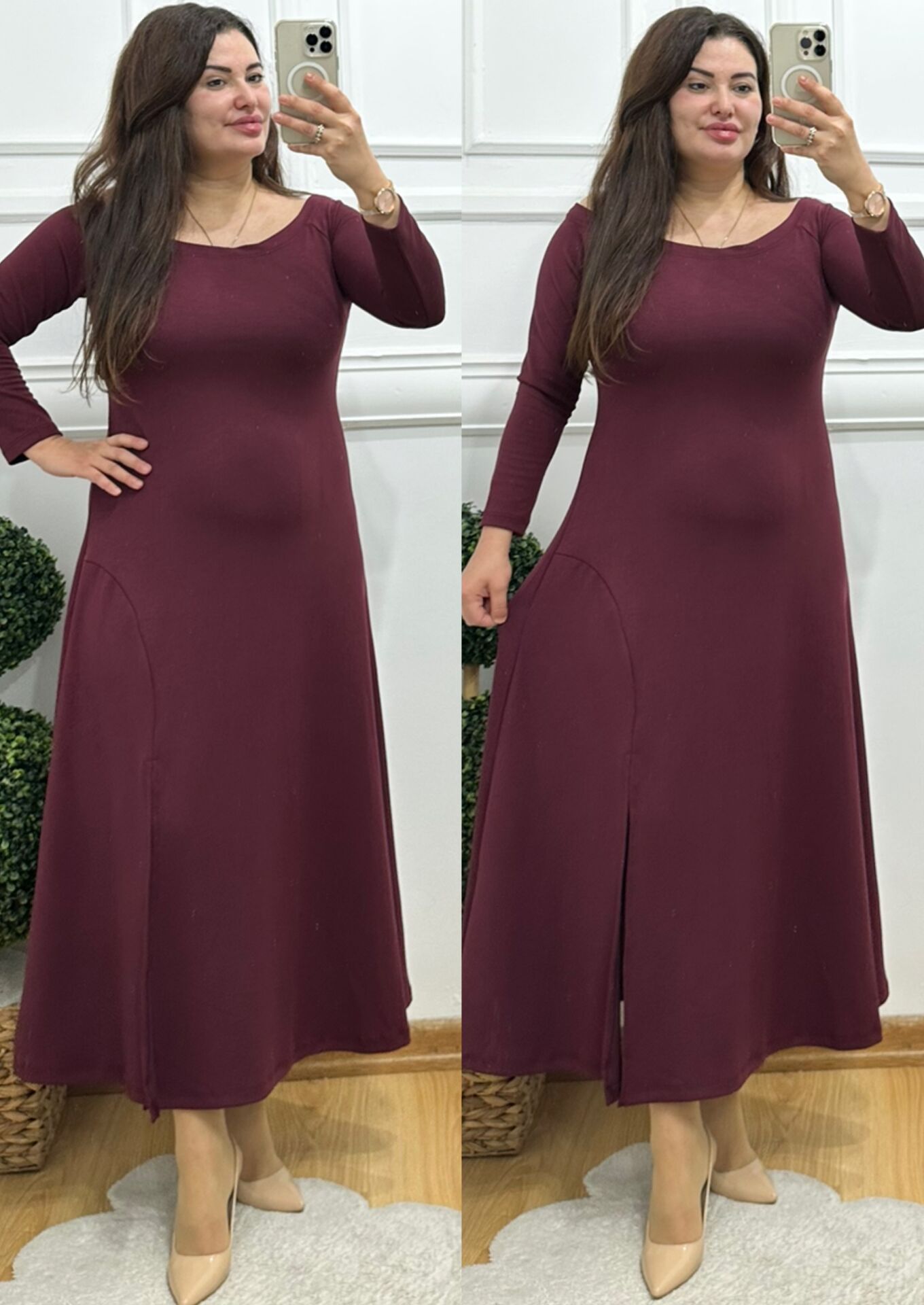 ZS121-Bordo madonna yaka oys yırtmaçlı elbise